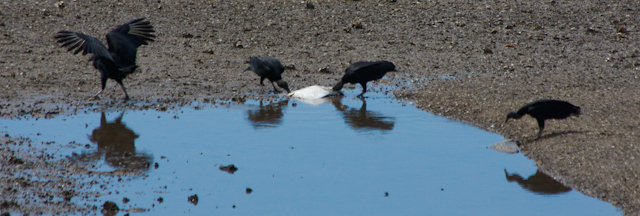An unserem letzten Tag hier in Costa Rica lassen wir uns mit dem Aufstehen Zeit. Erst um acht Uhr gehen wir gemütlich zum Frühstück. Wir genießen jeden Atemzug, wissen wir doch, dass wir heute die letzten Stunden in diesem Traumland verbringen werden. Nach dem leckeren Frühstück machen wir noch einmal einen ausgedehnten Spaziergang über das weitläufige Gelände der Lodge. Wir gehen zu dem Aussichtspunkt und setzen uns dort auf eine Holzbank. Viele Wasser- und Greifvögel fliegen über das Wasser. Wir beobachten zahlreiche Pelikane, die nur ganz knapp über der Wasseroberfläche fliegen. Auch die Fischer liegen bereits mit ihren kleinen Firscherbooten auf dem Wasser. Es ist Ebbe und wir können an einigen Wassertümpeln auf dem nun frei liegenden Meeresboden Gruppen von Geiern erkennen. Bei genauerem Hinsehen und Beobachtung durch das Fernglas erkennen wir viele tote Rochen, die auf dem Grund liegen, an denen sich die Geier laben. Wir wundern uns, dass es so viele Rochen sind, können darauf aber keine Antwort finden.